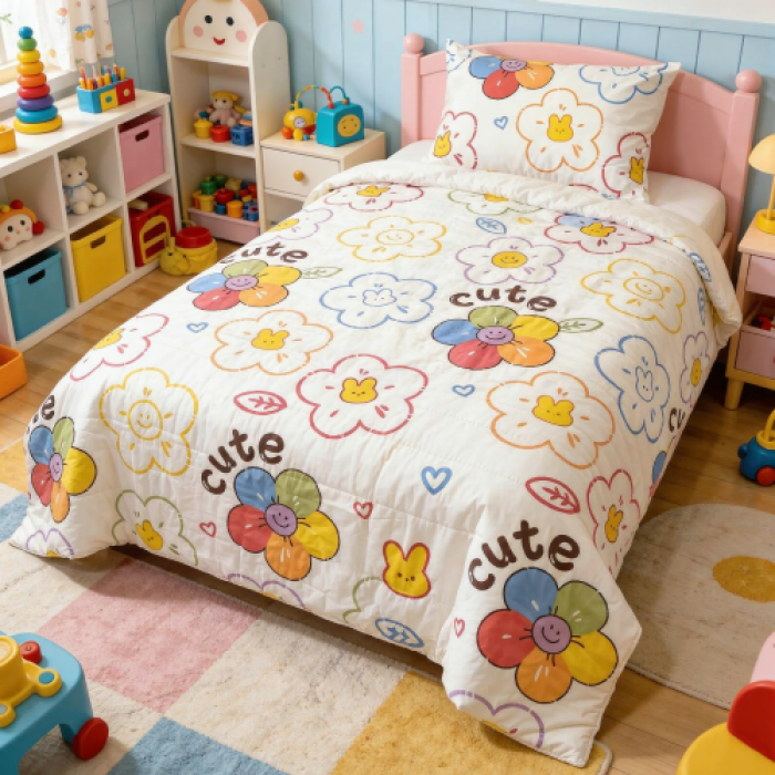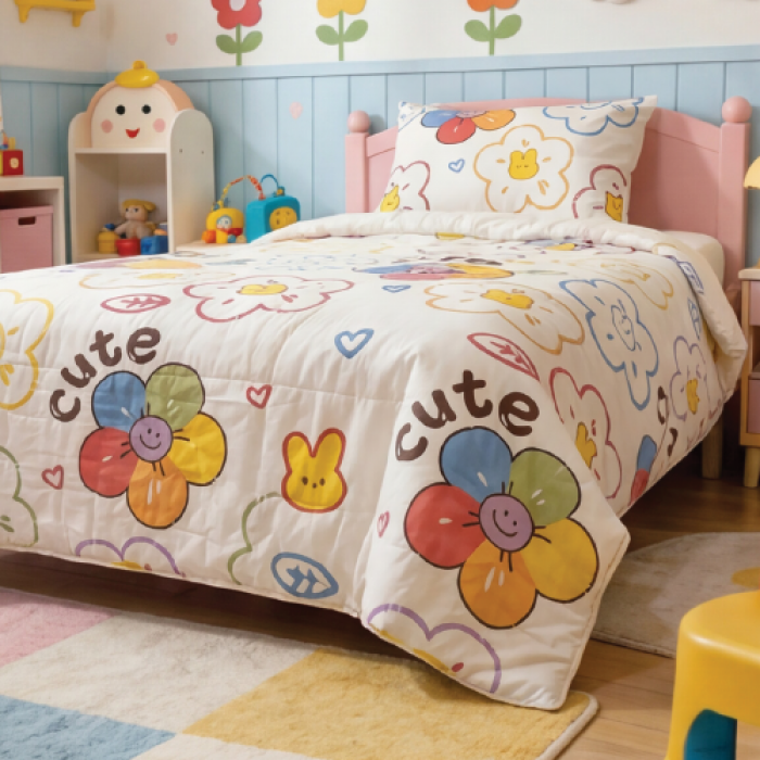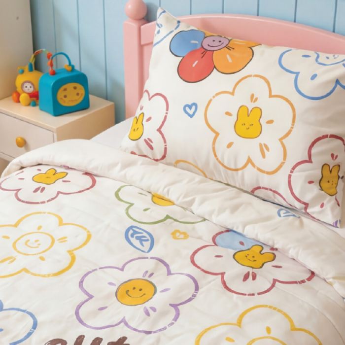 Сет од јорган и перница за деца. Шарен и весел дезен кој ќе донесе комфорт и позитивно расположение во собата на вашите малечки. Неутрален дезен, кој одговара и за момчиња и за девојчиња. Супер-квалитетен принт кој ќе ја задржи свежината на боите и по долго користење. Може целосно да се пере во машина до 40 степени.