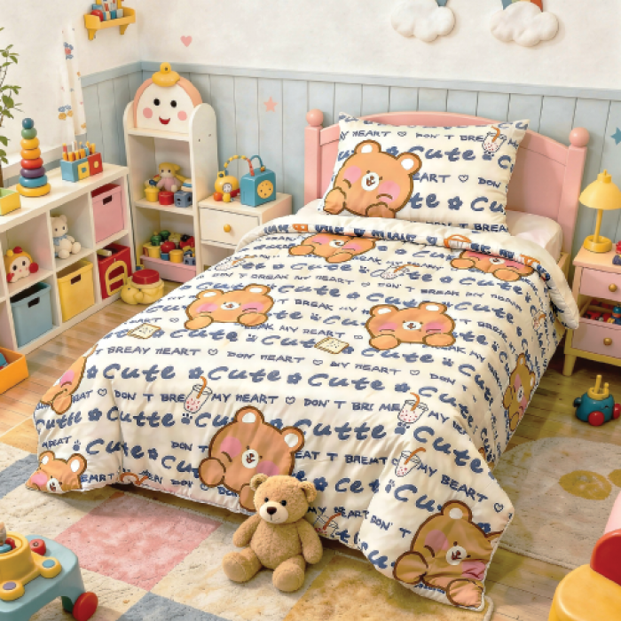 Сет од јорган и перница за децаНежен дезен кој ќе донесе комфорт и позитивно расположение во собата на вашите малечки.